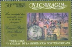 50-centavos airmail postage stamp depicts the 1774 Boston Tea Party and a 3-pence coin.