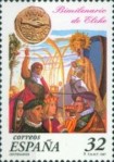 2-euro stamp depicts 2-euro coin which depicts Burgos Cathedral.