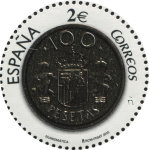 2-euro stamp depicts obverse of 1944 1-peseta coin.