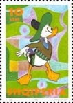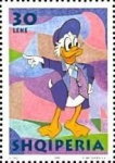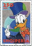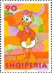 Unnamed, uncredited, apparently Disney's Donald Duck. 10-lek stamp depicts Donald Duck in a cowboy outfit; 30-lek stamp depicts Donald Duck pointing; 90-lek stamp depicts Daisy Duck; 250-lek stamp depicts Donald Duck in a top hat.