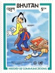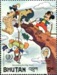 5-ngultrum stamp depicts Mickey Mouse, Donald Duck, and Goofy;