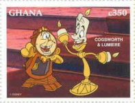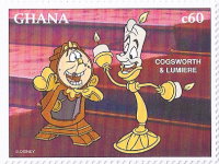 350-cedi stamp depicts Cogsworth and Lumiere;