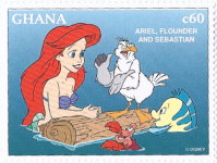 60-cedi stamp depicts Ariel, Flounder, and Sebastion;