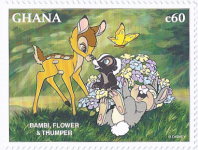 60-cedi stamp depicts Bambi, Flower, and Thumper;