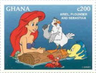200-cedi stamp depicts Ariel, Flounder, and Sebastion;