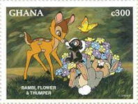 300-cedi stamp depicts Bambi, Flower, and Thumper;