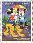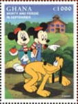 1000-cedi stamp depicts Mickey Mouse, Minnie Mouse, and Pluto;