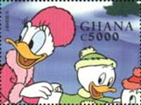 5000-cedi stamp depicts Daisy Duck and Louie.