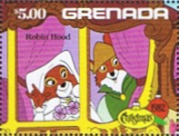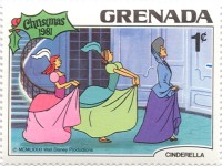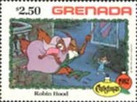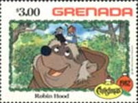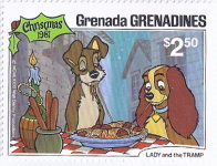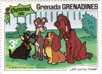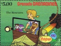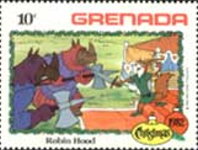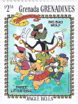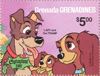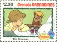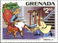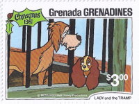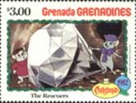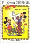1/2-cent stamp depicts Goofy; 1-cent stamp depicts Clarabelle Cow; 2-cent stamp depicts Donald Duck; 3-cent stamp depicts Pluto; 4-cent stamp depicts Morty and Ferdie; 5-cent stamp depicts Huey, Dewey, and Louie; 10-cent stamp depicts Daisy Duck and Chip and Dale; $2.50 stamp depicts the Big Bad Wolf and the Three Little Pigs; $3 stamp depicts Mickey Mouse; $5 stamp depicts Donald Duck.