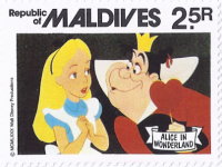 2.50-rufiyaa stamp depicts Alice and Queen of Hearts;