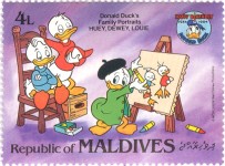 3-rufiyaa stamp depicts Donald Duck and Daisy Duck;