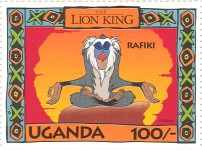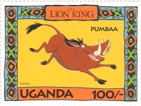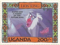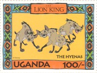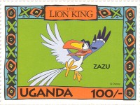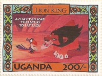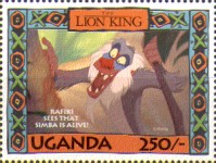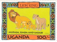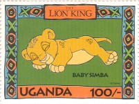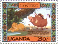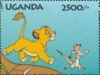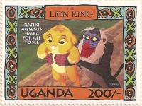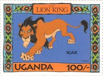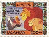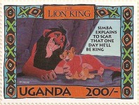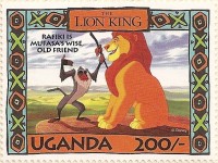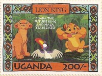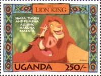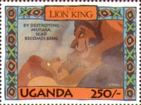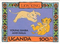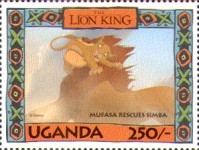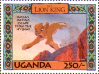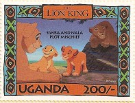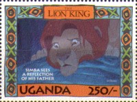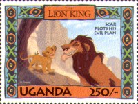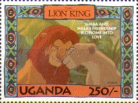 100-shilling stamp depicts Simba; 100-shilling stamp depicts Mufasa, Simba, Sarabi; 100-shilling stamp depicts Simba and Nala; 100-shilling stamp depicts Timon; 100-shilling stamp depicts Rafiki; 100-shilling stamp depicts Pumbaa; 100-shilling stamp depicts the hyenas; 100-shilling stamp depicts Scar; 100-shilling stamp depicts Zazu; 200-shilling stamp depicts Rafiki and Mufasa; 200-shilling stamp depicts Rafiki, Mufasa, and Sarabi; 200-shilling stamp depicts Rafiki and Simba; 200-shilling stamp depicts Scar and Zazu; 200-shilling stamp depicts Rafiki; 200-shilling stamp depicts Simba and Scar; 200-shilling stamp depicts Simba and Nala; 200-shilling stamp depicts Simba; 200-shilling stamp depicts Simba, Nala, and Zazu; 250-shilling stamp depicts Scar; 250-shilling stamp depicts Mufasa and Simba; 250-shilling stamp depicts Mufasa; 250-shilling stamp depicts Simba; 250-shilling stamp depicts Timon, Pumbaa, and Simba; 250-shilling stamp depicts Simba, Timon, and Pumbaa; 250-shilling stamp depicts Rafiki; 250-shilling stamp depicts Simba and Nala; 250-shilling stamp depicts Simba; 2500-shilling stamp depicts Simba and Timon; 2500-shilling stamp depicts Rafiki, Mufasa, Simba, Sarabi, Zazu; 2500-shilling stamp depicts anonymous animals.