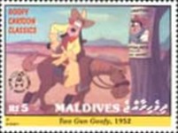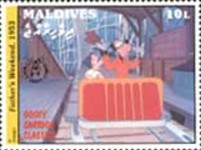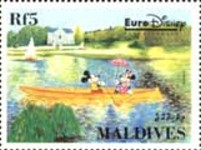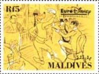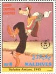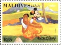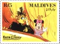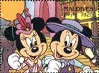 5-rufiyaa stamp depicts Mickey Mouse and Minnie Mouse;