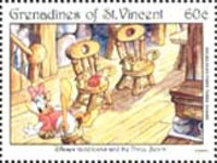 80-shilling stamp depicts Minnie Mouse, Donald Duck, and Daisy Duck;